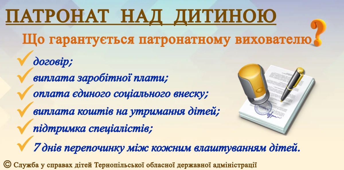 Патронат над дитиною – це тимчасова форма сімейного виховання, коли дитину приймає у свою сім’ю патронатний вихователь. Держава гарантує підтримку таким сім’ям: оплату праці, кошти на утримання дітей, соціальні гарантії та допомогу фахівців